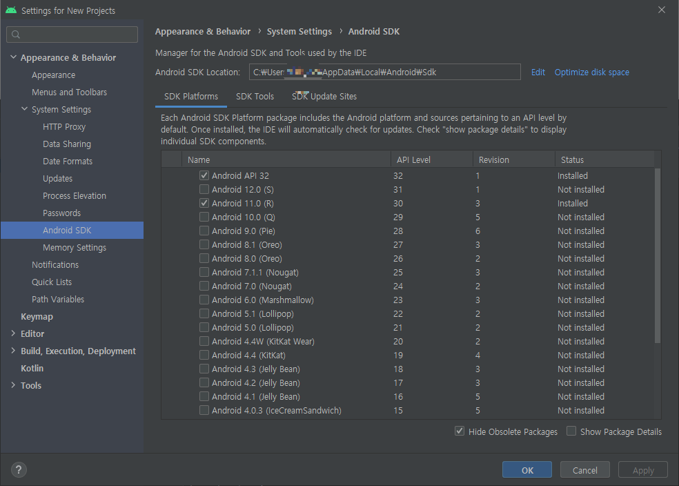 Project에서 설정한 buildToolsVersion 버전 설치 한다
