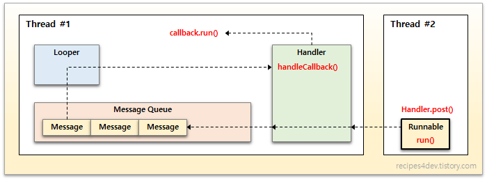 핸들러는 핸들러 객체를 만든 스레드와 해당 스레드의 message queue 에 바인딩된다. Message queue 는 핸들러가 전달하는 message 를 보관하는 FIFO(First In First Out) 방식의 큐이다. 다른 스레드에게 메시지를 전달하려면 메시지를 전달하려는 스레드에서 생성한 핸들러의 post() 와 sendMessage() 등의 함수를 사용해야한다. 그래야 수신대상 message queue 에 메시지가 저장되기 때문이다.